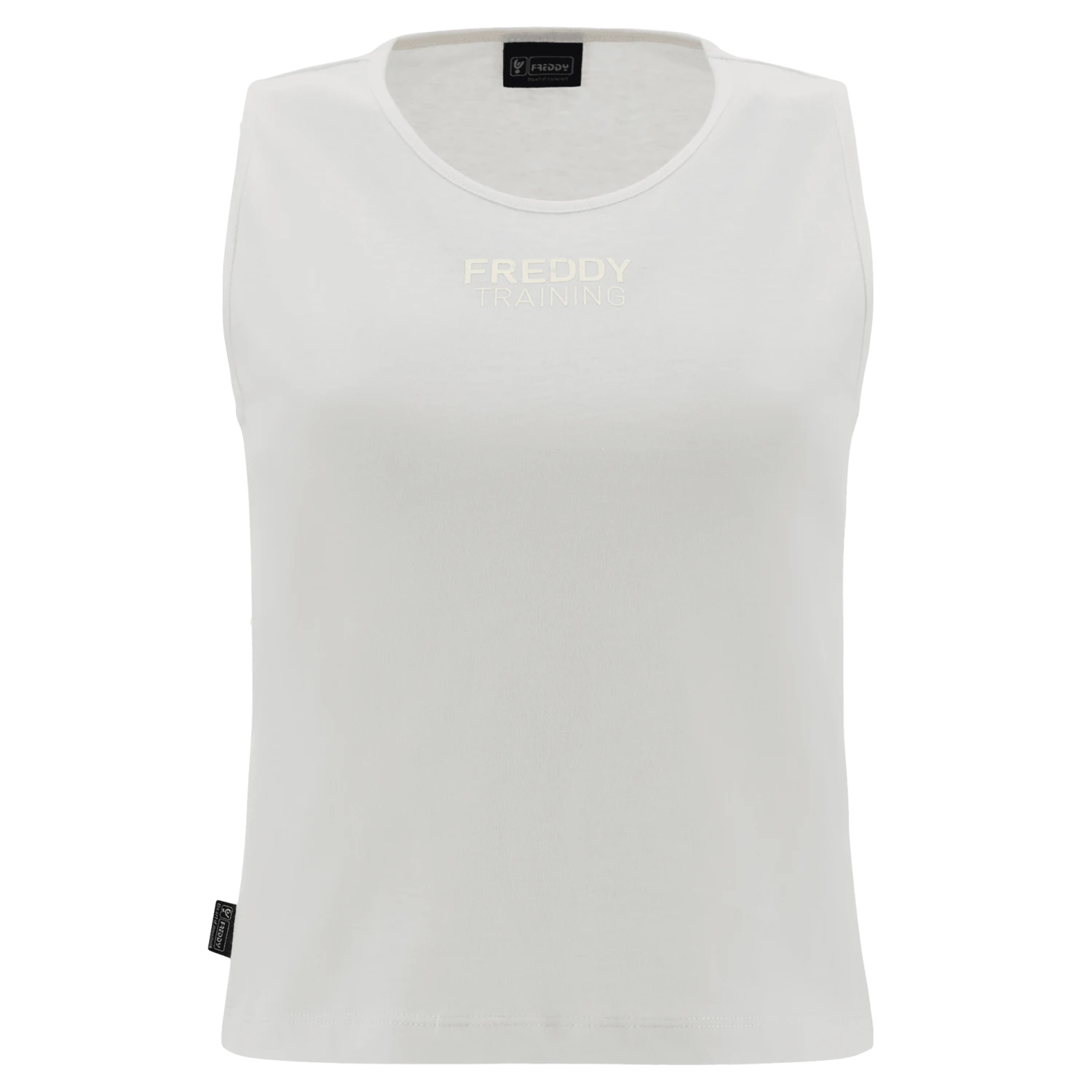 Crop top in jersey di cotone decorato con la stampa centrale FREDDY TRAINING lucida in colore oro chiaro posizionata sotto lo scollo. Ha scollo a girocollo, spalline larghe e taglio corto in vita. La vestibilità slim si intreccia alla naturale morbidezza del tessuto nel favorire una gradevole aderenza alle linee del corpo donando ampiezza di movimento. Capo versatile dal design essenziale e fresco, perfetto per completare svariati outfit sportivi e per il tempo libero all’insegna della comodità con stile.