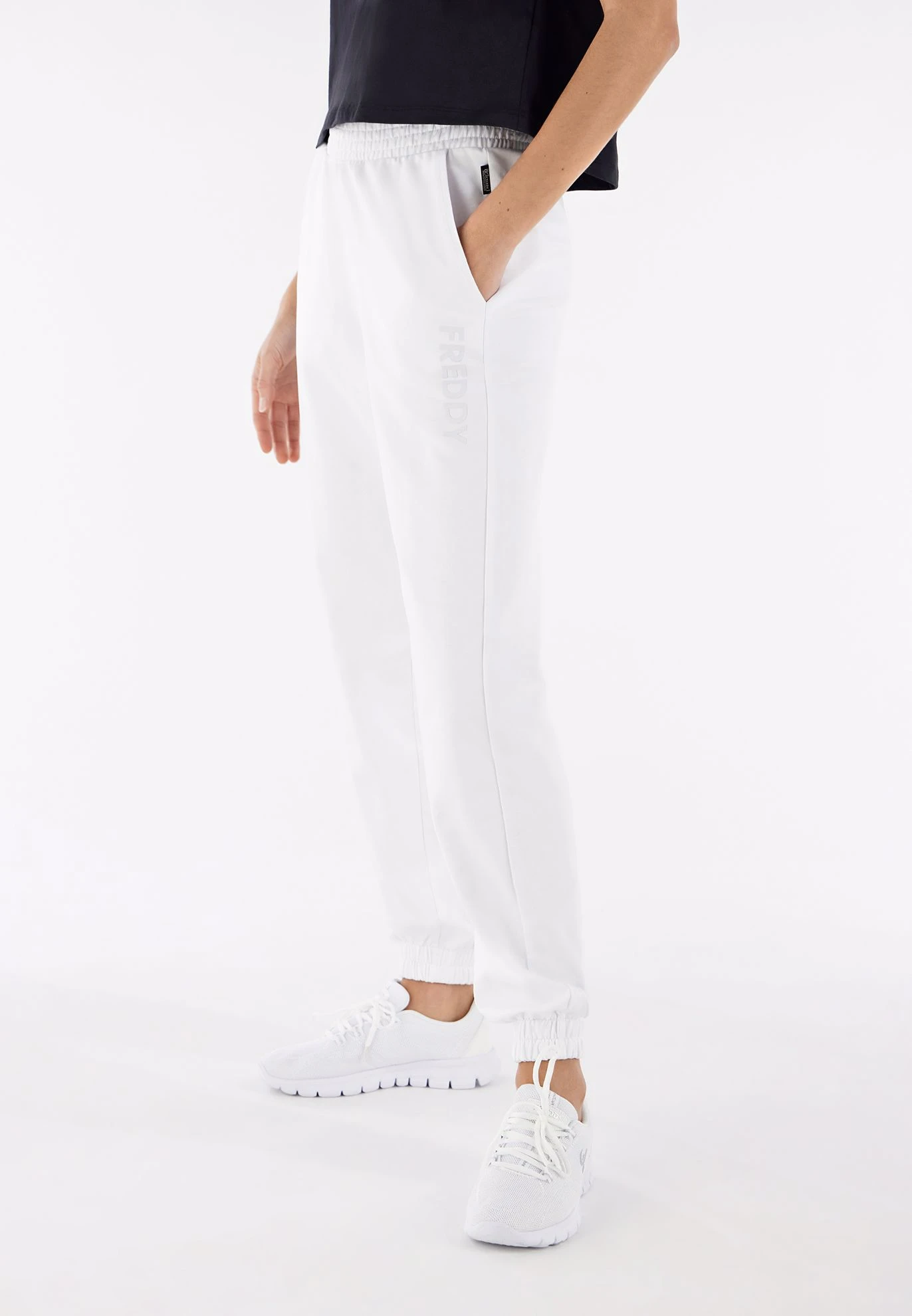 Pantaloni sportivi leggeri in morbido french terry con vita e fondo a polsino dotati di elastico interno. Il modello presenta tasche frontali interne alla francese e vestibilità comfort. La stampa verticale FREDDY spessorata opaca in tono sotto la tasca sinistra completa i dettagli di stile di questo campo votato alla comodità e alla libertà di movimento, perfetto per l’attività sportiva e il tempo libero dinamico.