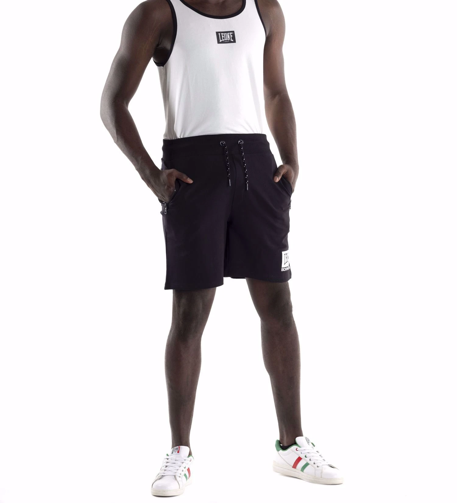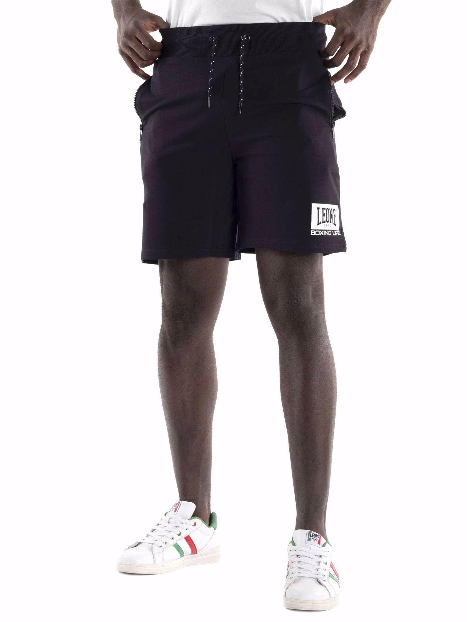 Pantaloncini da uomo Leone 1947 Apparel linea Logo Basic, versatili e funzionali, adatti all’attività sportiva e per il tempo libero. Realizzati in felpa elasticizzata. Il capo presenta numerosi dettagli: costina elastica in vita, coulisse bicolore in contrasto colore, ampie tasche con zip, stampa gommata del logo Leone 1947 sulla coscia. Etichette tessute sono cucite all’interno del capo.