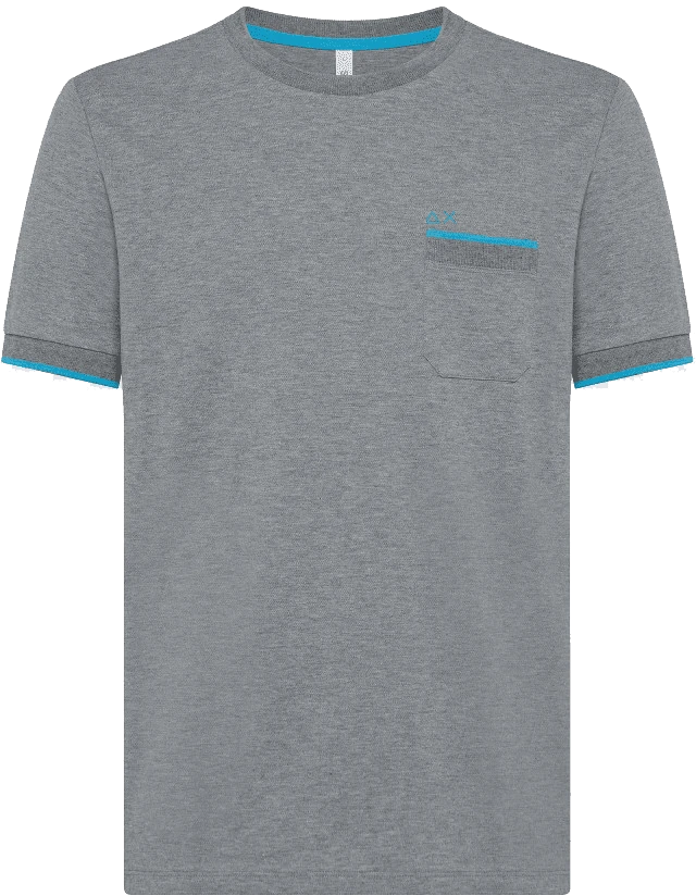 -SHIRT A GIROCOLLO IN PIQUET DI COTONE ELASTICIZZATO TINTA UNITA GRIGIA, TASCHINO APPLICATO SUL PETTO CON STEMMA LOGO CUCITO A CONTRASTO, FONDO MANICA AZZURRO.